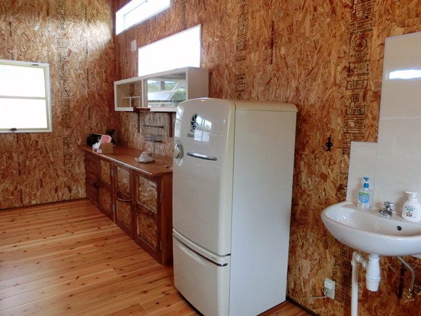 食器棚も作業カウンターも扉には流木で作った取っ手が付いて素敵な出来あがり。