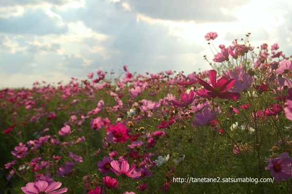 夕暮れ時のコスモス畑も絵になりますよ。