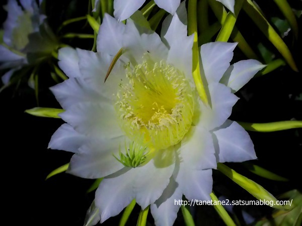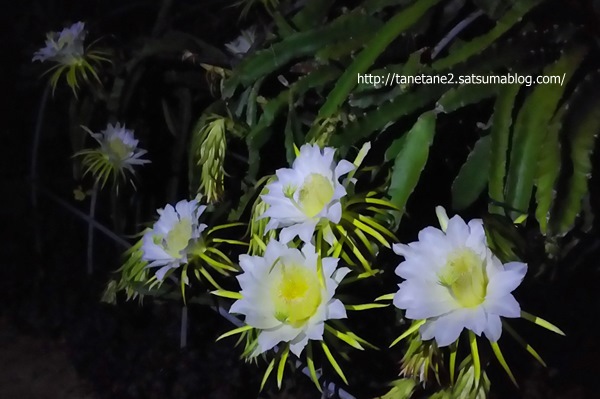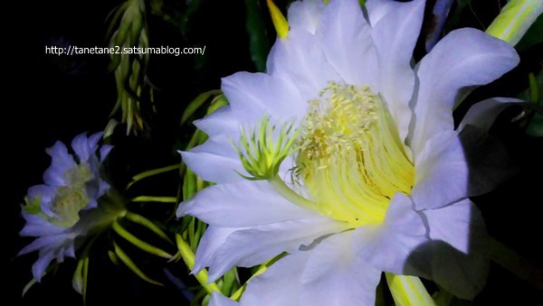 自転車親父さん こんばんはドラゴンフルーツの花は月下美人と似ています。朝には萎んでいるので寝坊の私は夜しかシャッターチャンスがありません(^^ゞ